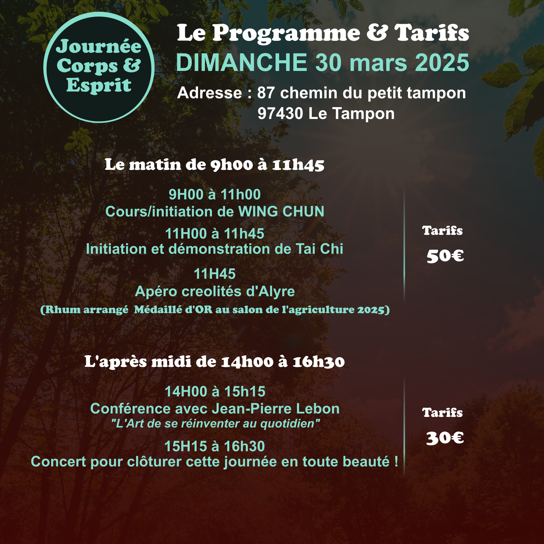 L'après-midi : Conférence "L'Art de se réinventer au quotidien" avec Jean Pierre LEBON + concert (30€)